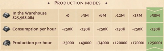 Note that the production per hour that is shown in the building (see screenshot above) is only the base rate. It does not include the bonuses from the tile where it is placed on or clan researches that improve the production.