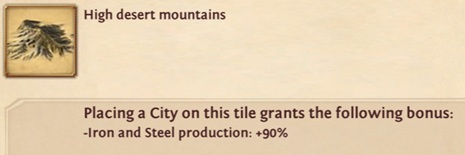 Before placing it, it is therefore important to search for a tile that offers the best bonus for Steel production (usually a high desert mountain). To see the bonus for a tile, just click on it. The highest available tile bonus is 90%.