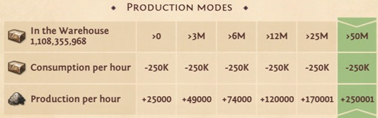 Note that the production per hour that is shown in the building (see screenshot above) is only the base rate. It does not include the bonuses from the tile where it is placed on or clan researches that improve the production.