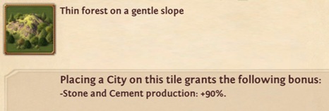 Before placing it, it is therefore important to search for a tile that offers the best bonus for Cement production (usually a gentle slope). To see the bonus for a tile, just click on it. The highest available tile bonus is 90%.